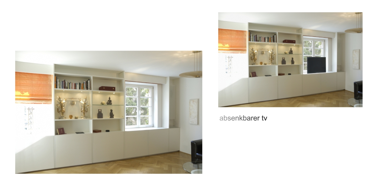 entwurf einer regal -, unterschrank-kombination mit beleuchteten vitrinenelementen und absenkbarem tv |